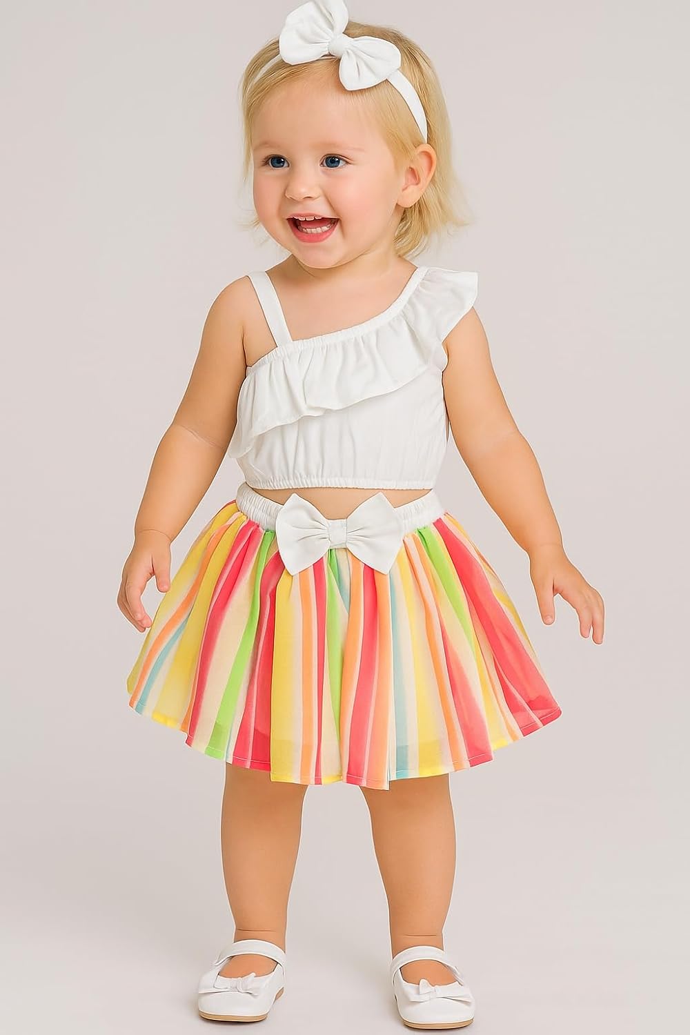 Dress your little one in adorable elegance with the A.T.U.N. Stylish Fancy Baby Girls Mauve Three-Piece Set. This set includes a one-shoulder poly silk crop top with a cute frill, a wave-patterned mesh skirt with a rainbow accent and a big bow, and a matching headband. Perfect for birthdays, parties, and special occasions, this outfit makes your baby girl stand out in style and comfort.