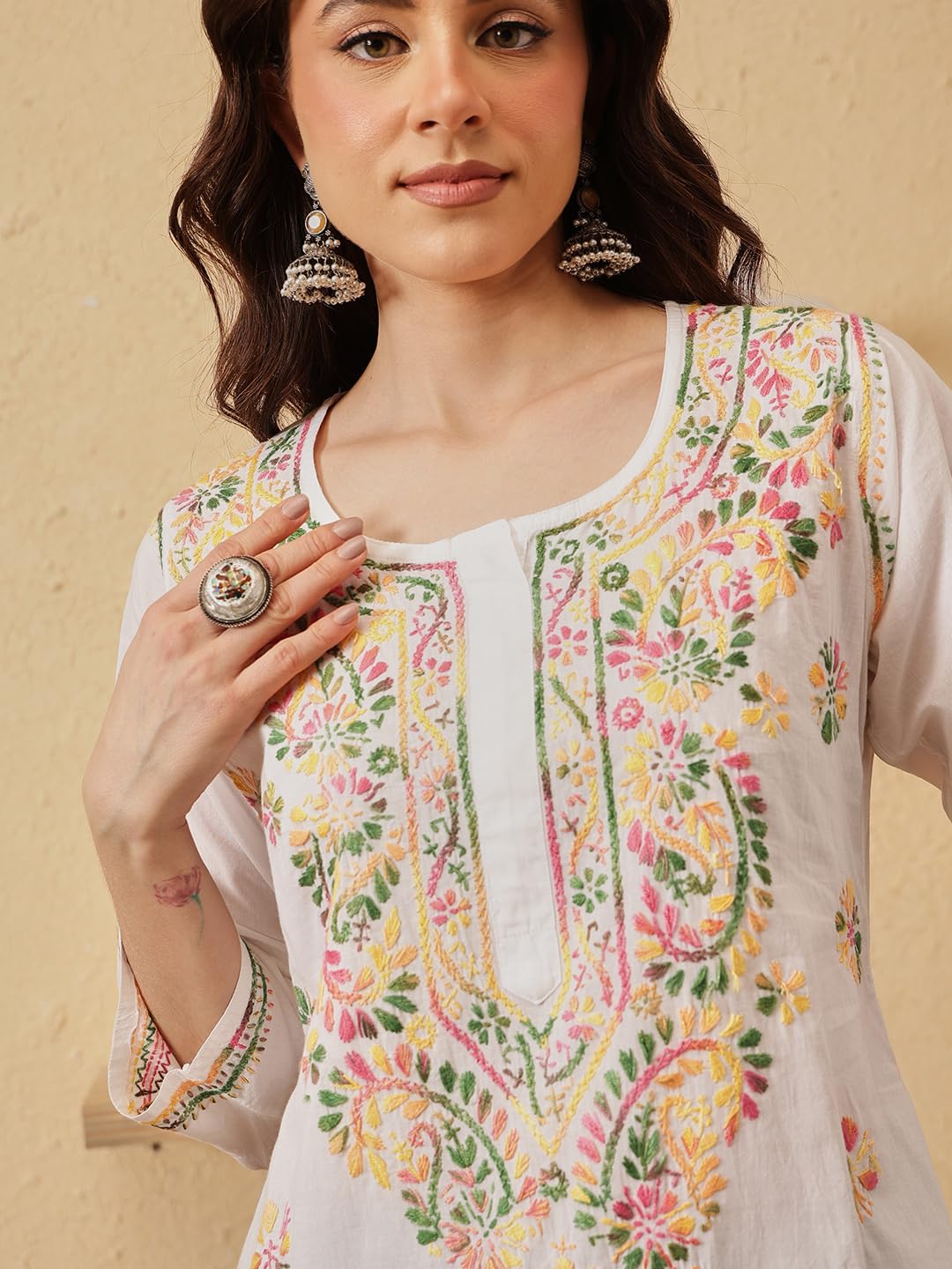 Breezy and elegant, this White Cotton Chikan Top is a celebration of timeless hand embroidery and modern style. Adorned with intricate Ulti Bakhiya, Keel Kangan, and Ghas Patti stitches, each thread is delicately woven using multi-colored cotton, creating a vibrant yet graceful look. Its lightweight fabric ensures day-long comfort, while the pastel palette makes it a perfect pick for summer outings or casual workdays. Handcrafted by skilled artisans and GI-tagged for authenticity, every piece carries subtle variations that highlight the uniqueness of true craftsmanship. Pre-washed for zero color bleed or shrinkage, this top lets you flaunt heritage with a fresh, contemporary twist.