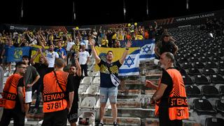 Maccabi Tel Aviv’s fans chant slogans at the end of the Europa League match between PAOK and Maccabi Tel Aviv at Toumpa stadium, in Thessaloniki, Greece