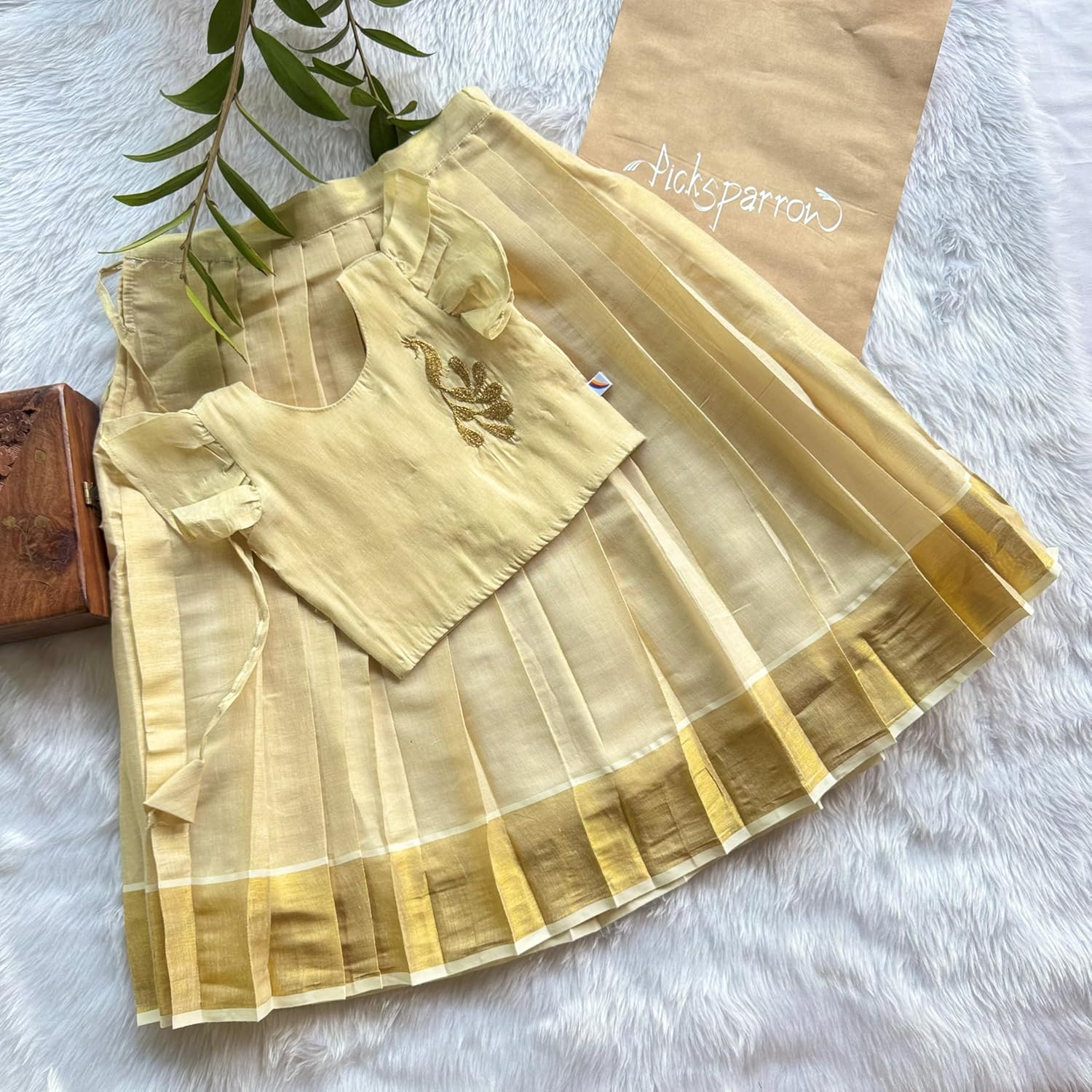 Dress your little princess in traditional elegance with this beautiful Kasavu Pattupavada set. The ensemble features a stunning cream-coloured pavada (skirt) with classic pleats and an eye-catching golden border that adds a touch of festive charm. The accompanying blouse showcases delicate peacock embroidery work in golden thread, making it perfect for special occasions. The flutter sleeves on the blouse add a playful, feminine touch that little girls will love. This traditional Kerala-style outfit combines comfort with cultural authenticity, making it an ideal choice for festivals, family gatherings, or cultural events. The premium tissue cotton kasavu fabric ensures breathability and comfort for your little one. The pleated design of the pavada creates graceful movement, while the contrast of the blouse against the cream and gold pavada creates a striking visual appeal. This timeless piece from Picksparrow brings together traditional craftsmanship with contemporary styling.